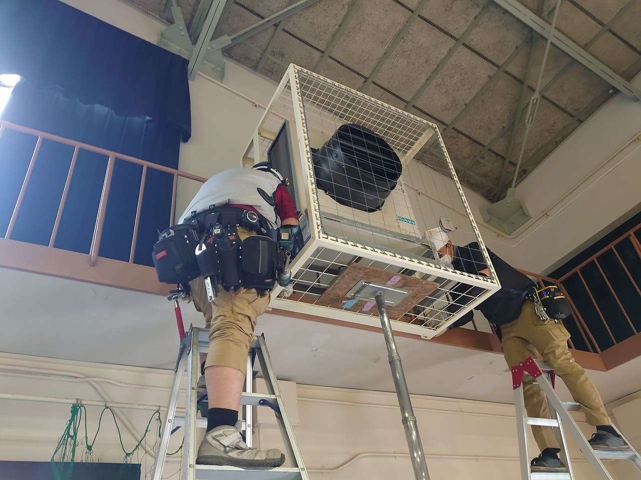 都内中野区の某公共施設にて、細田電機株式会社が大型空調設備の新規設置工事を行いました。施設の利用者が多いため、施工中の安全対策を徹底し、既存の建物構造を活かした効率的な取付方法を検討。室内高がある現場のため、高所作業用の足場や専用リフトを活用し、機器本体の据付から配管・電源工事、動作確認まで一貫して自社スタッフで対応しました。